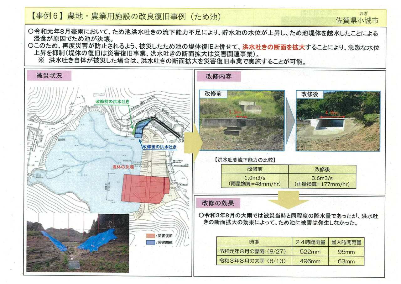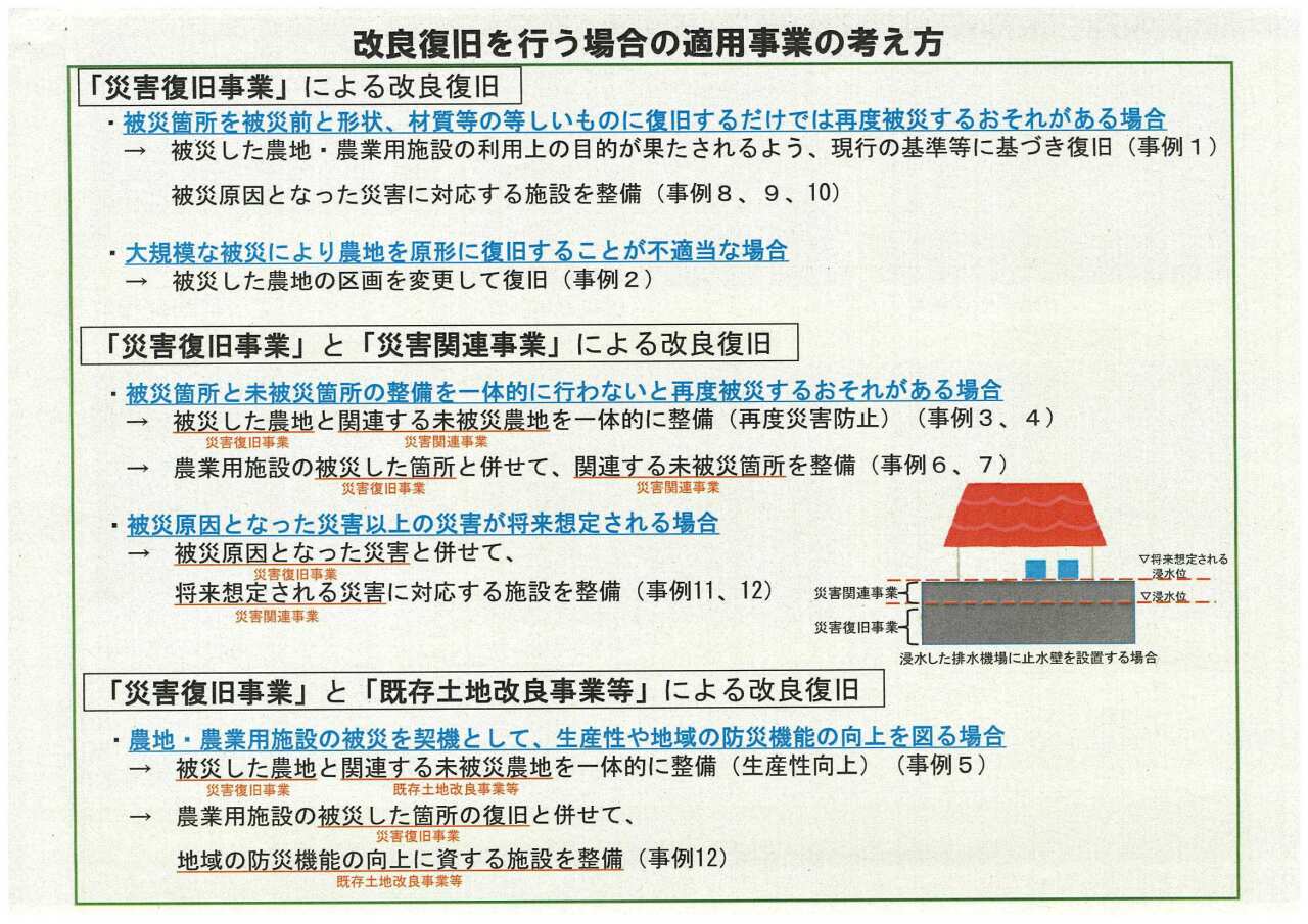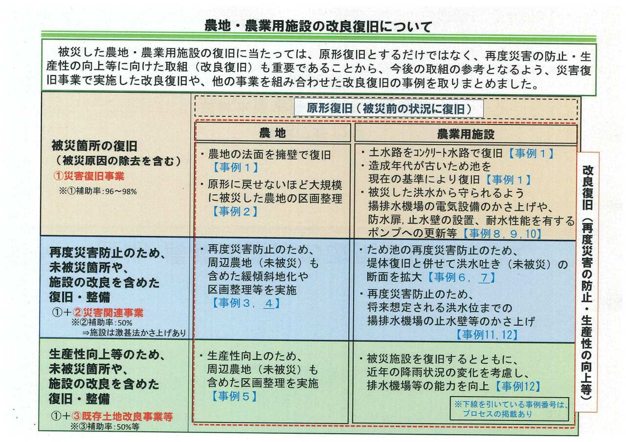 - 災害復旧事業による改良 壊れた箇所を単に直すだけでなく、現在の設計基準に照らして、より強固な擁壁(土留め)を作ったり、土の水路をコンクリート製に作り替えたりすることが可能です。大規模な被災で元の形に戻せない場合は、区画整理を伴う復旧も認められます。